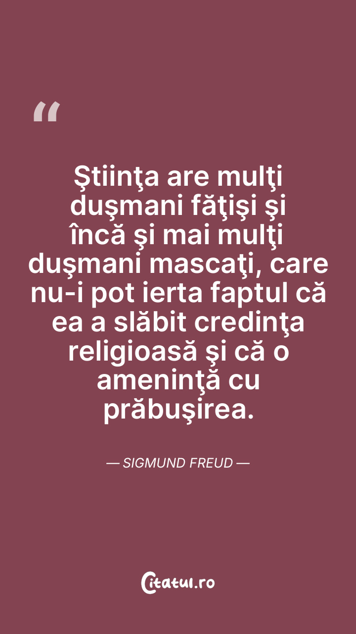 Ştiinţa are mulţi duşmani făţişi şi încă şi mai mulţi duşmani mascaţi, care nu-i pot ierta faptul că ea a slăbit credinţa religioasă şi că o ameninţă cu prăbuşirea. Sigmund Freud