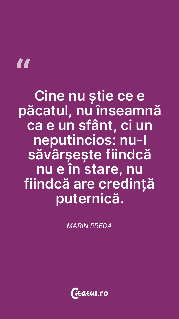 Cine nu știe ce e păcatul, nu înseamnă ca e un sfânt, ci un neputincios: nu-l săvârșește fiindcă nu e în stare, nu fiindcă are credință puternică. Marin Preda