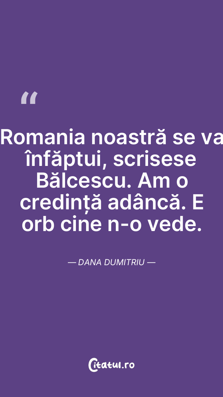 Romania noastră se va înfăptui, scrisese Bălcescu. Am o credință adâncă. E orb cine n-o vede. Dana Dumitriu