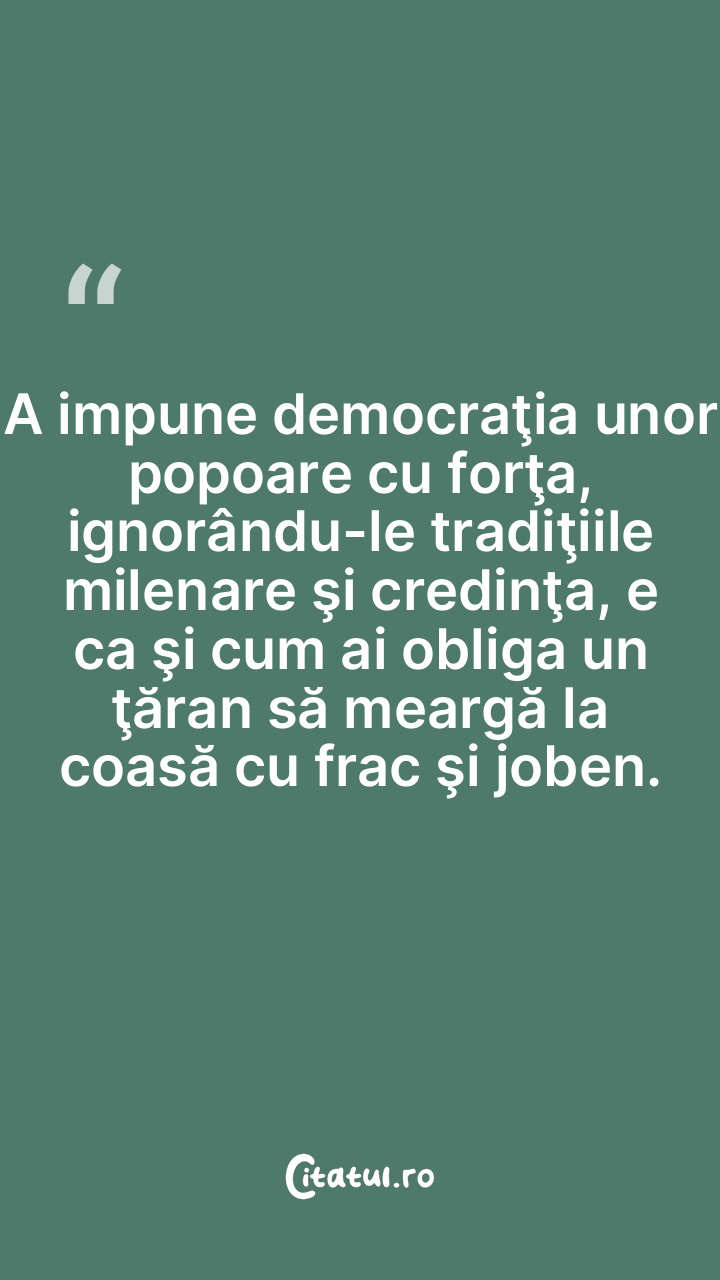A impune democraţia unor popoare cu forţa, ignorându-le tradiţiile milenare şi credinţa, e ca şi cum ai obliga un ţăran să meargă la coasă cu frac şi joben.