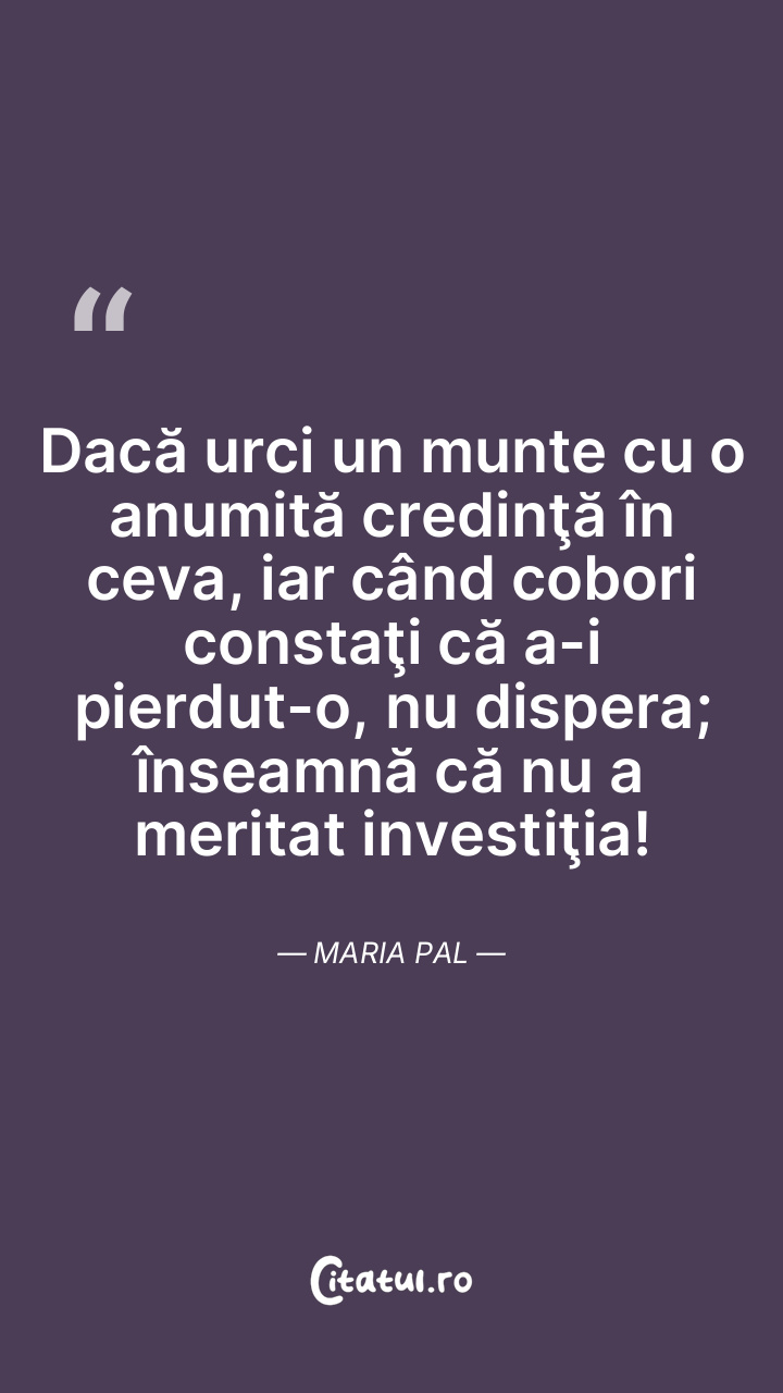 Dacă urci un munte cu o anumită credinţă în ceva, iar când cobori constaţi că a-i pierdut-o, nu dispera; înseamnă că nu a meritat investiţia! Maria Pal