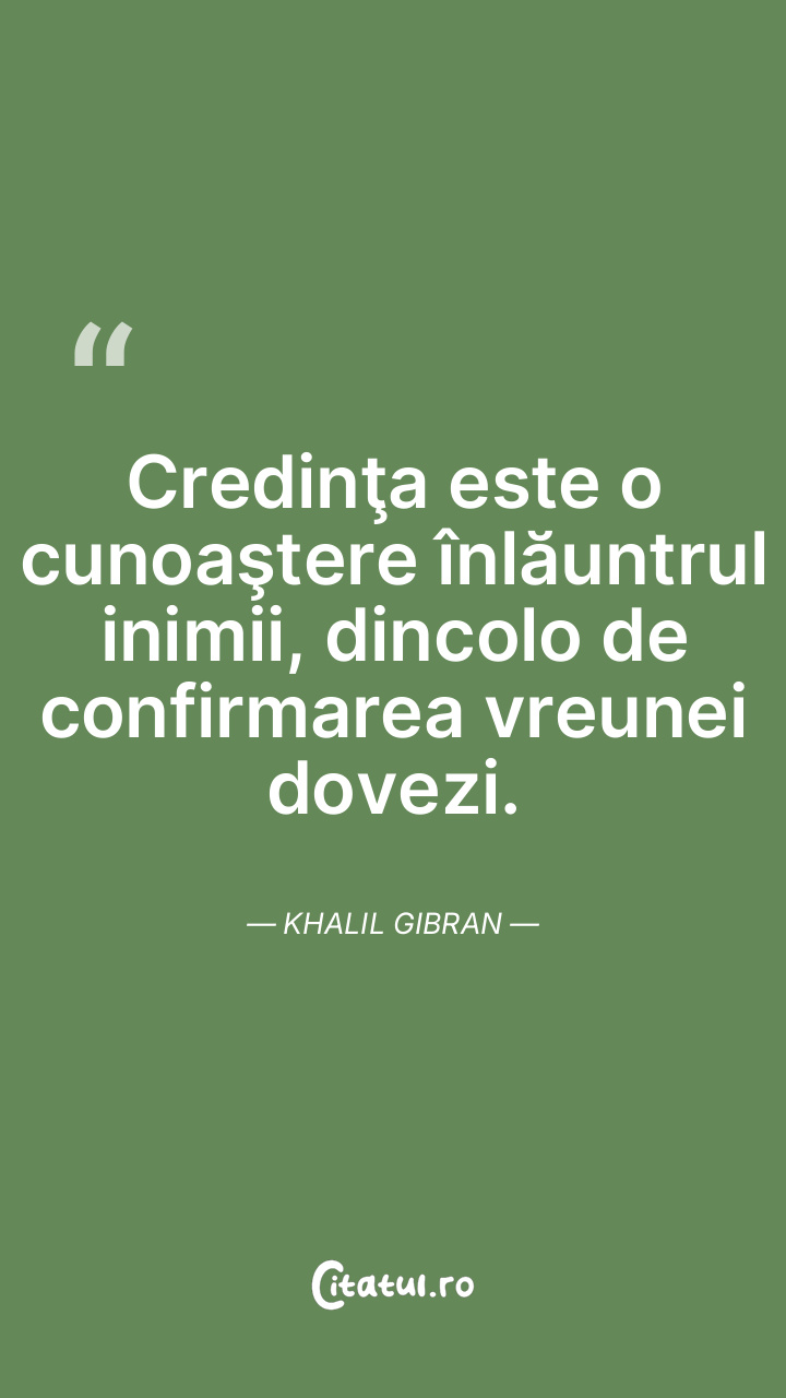 Credinţa este o cunoaştere înlăuntrul inimii, dincolo de confirmarea vreunei dovezi. Khalil Gibran