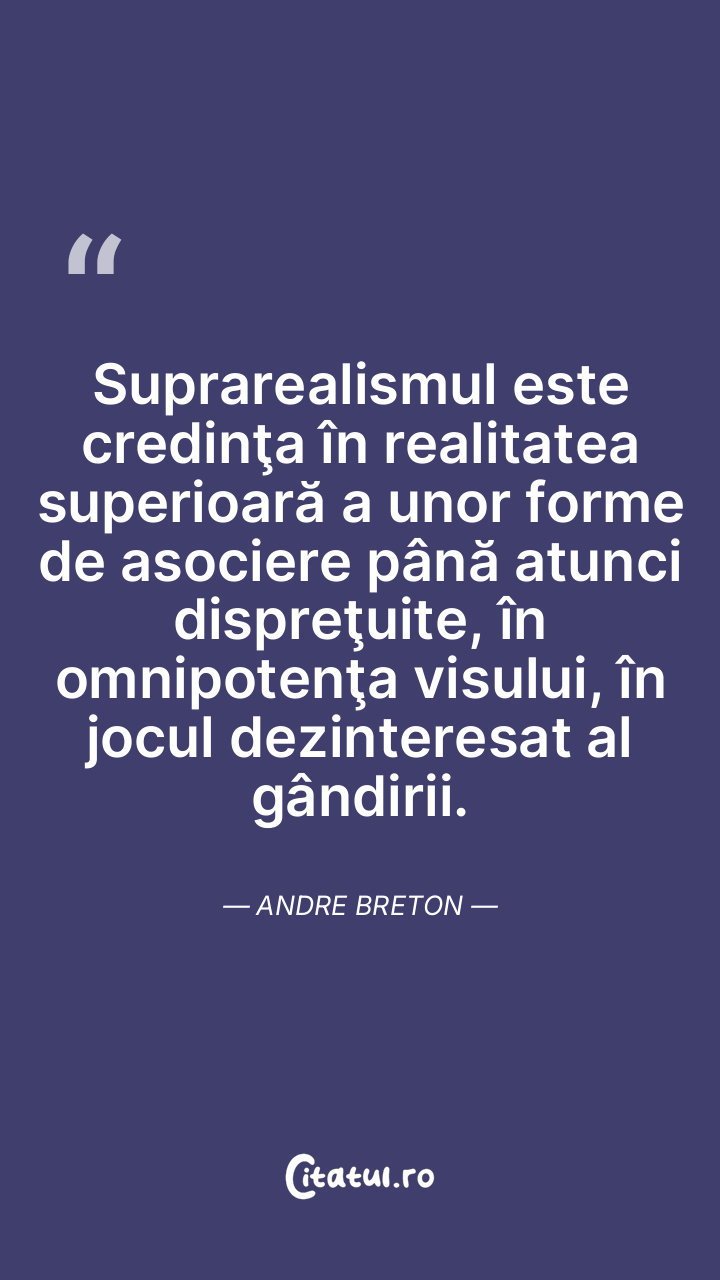 Suprarealismul este credinţa în realitatea superioară a unor forme de asociere până atunci dispreţuite, în omnipotenţa visului, în jocul dezinteresat al gândirii. Andre Breton