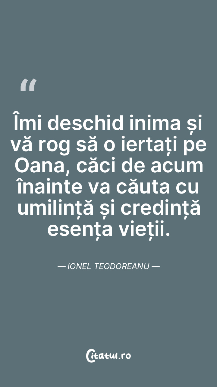Îmi deschid inima și vă rog să o iertați pe Oana, căci de acum înainte va căuta cu umilință și credință esența vieții. Ionel Teodoreanu