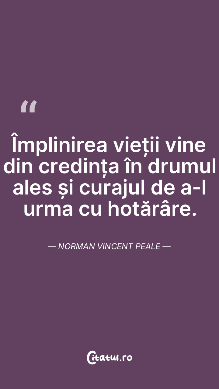Împlinirea vieții vine din credința în drumul ales și curajul de a-l urma cu hotărâre. Norman Vincent Peale