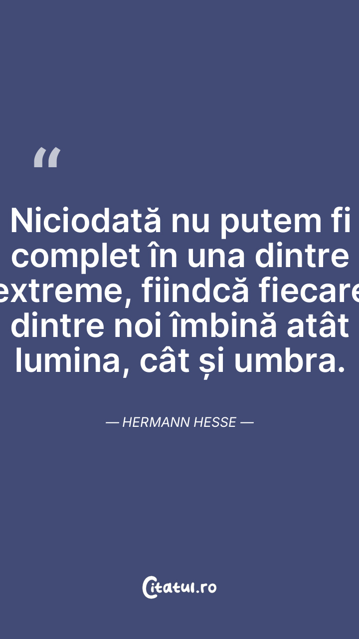 Niciodată nu putem fi complet în una dintre extreme, fiindcă fiecare dintre noi îmbină atât lumina, cât și umbra. Hermann Hesse