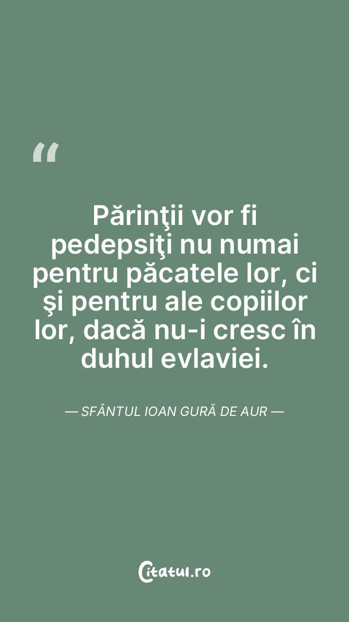 Părinţii vor fi pedepsiţi nu numai pentru păcatele lor, ci şi pentru ale copiilor lor, dacă nu-i cresc în duhul evlaviei. Sfântul Ioan Gură de Aur