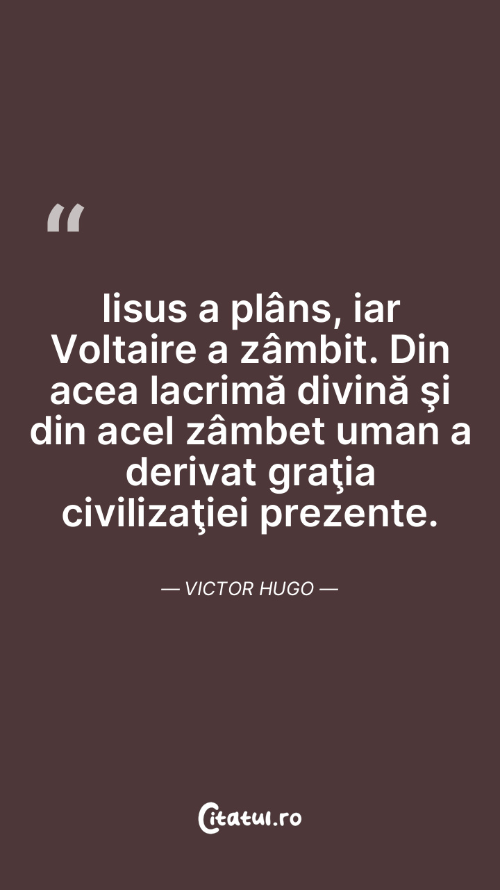 Iisus a plâns, iar Voltaire a zâmbit. Din acea lacrimă divină şi din acel zâmbet uman a derivat graţia civilizaţiei prezente. Victor Hugo