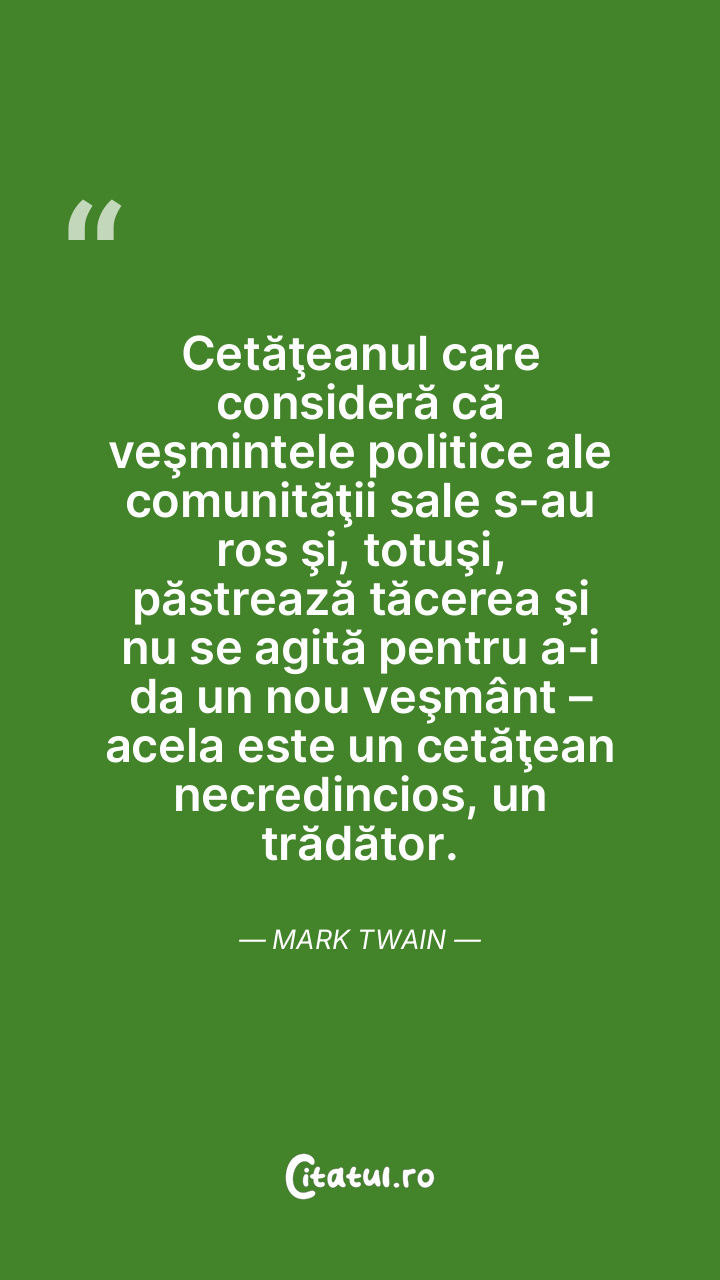 Cetăţeanul care consideră că veşmintele politice ale comunităţii sale s-au ros şi, totuşi, păstrează tăcerea şi nu se agită pentru a-i da un nou veşmânt – acela este un cetăţean necredincios, un trădător. Mark Twain