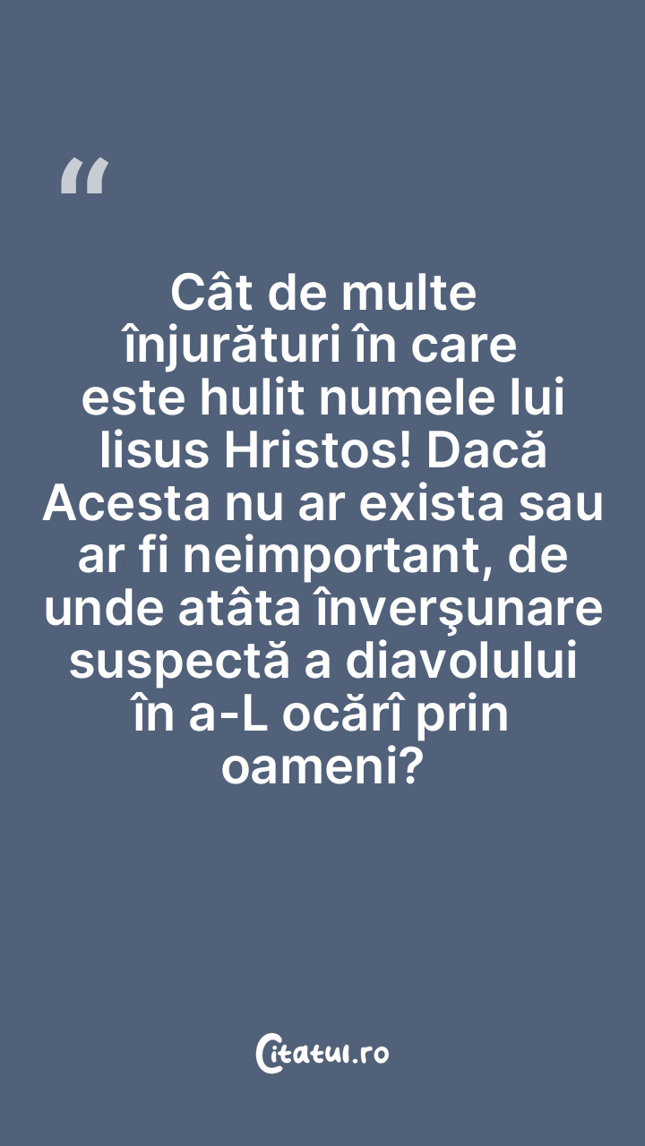 Cât de multe înjurături în care este hulit numele lui Iisus Hristos! Dacă Acesta nu ar exista sau ar fi neimportant, de unde atâta înverşunare suspectă a diavolului în a-L ocărî prin oameni?