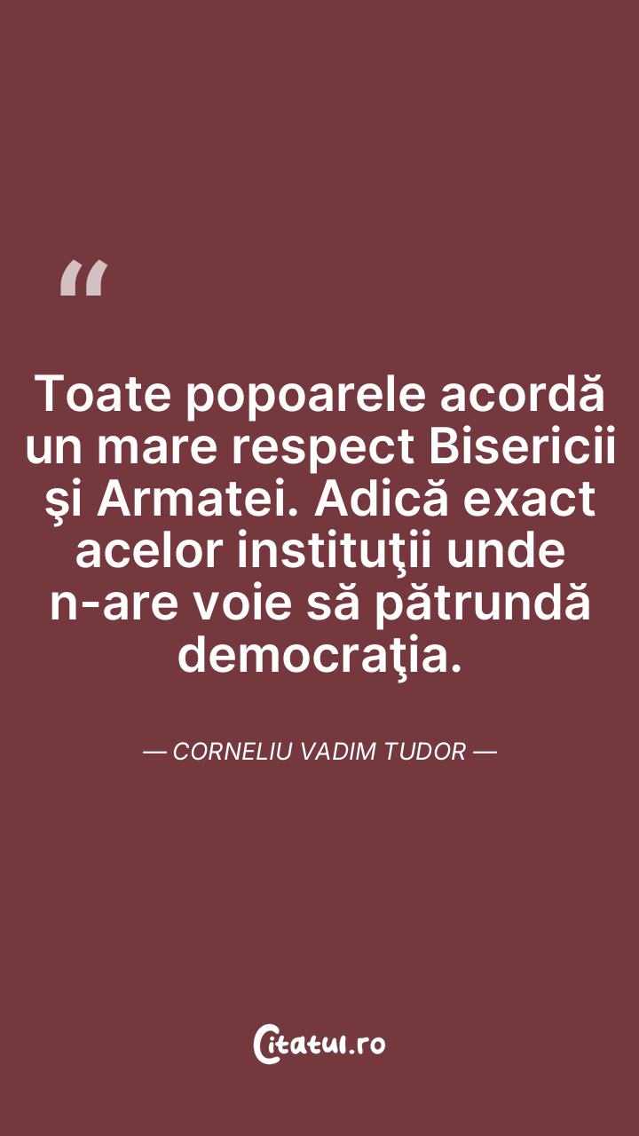 Toate popoarele acordă un mare respect Bisericii şi Armatei. Adică exact acelor instituţii unde n-are voie să pătrundă democraţia. Corneliu Vadim Tudor