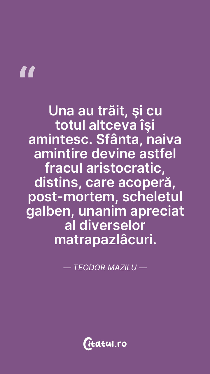 Una au trăit, şi cu totul altceva îşi amintesc. Sfânta, naiva amintire devine astfel fracul aristocratic, distins, care acoperă, post-mortem, scheletul galben, unanim apreciat al diverselor matrapazlâcuri. Teodor Mazilu