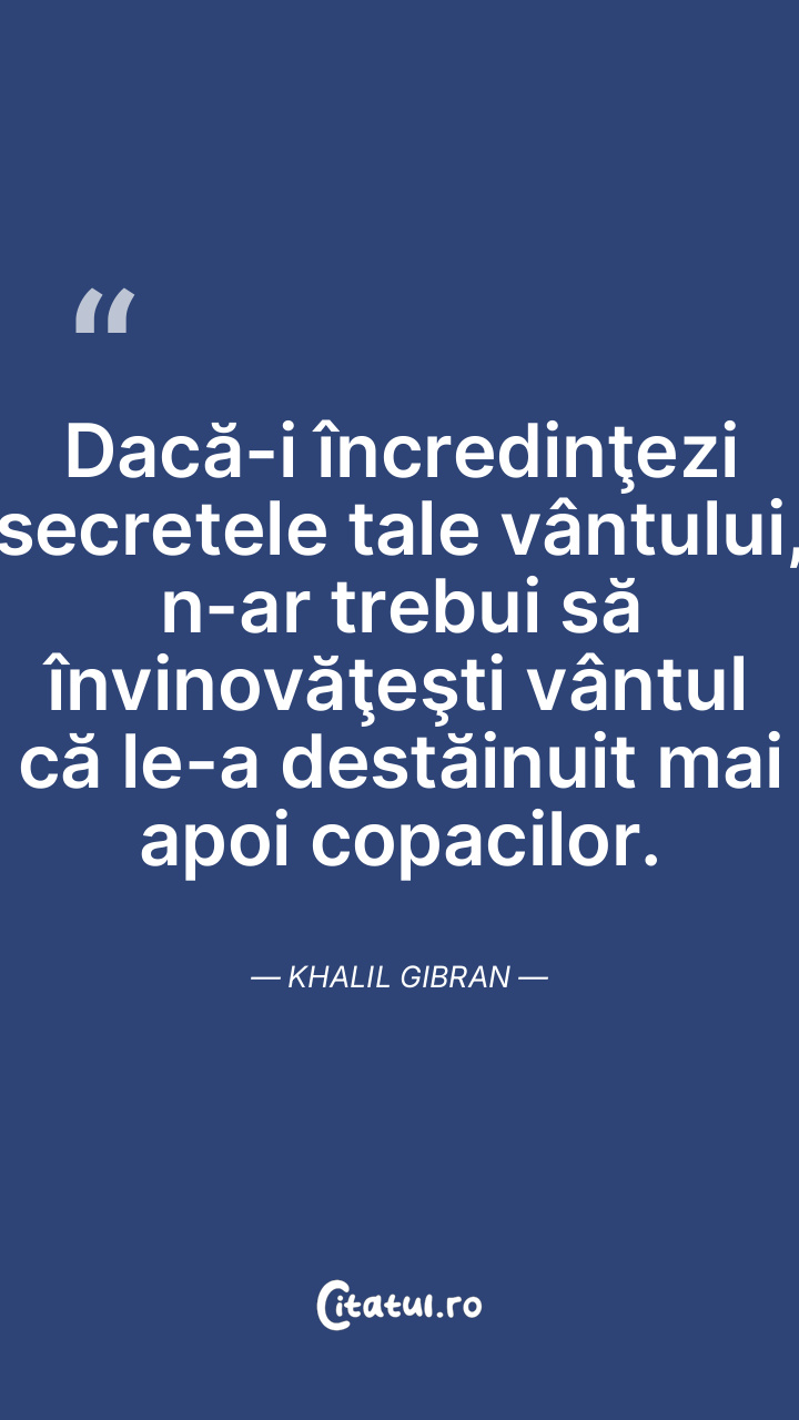 Dacă-i încredinţezi secretele tale vântului, n-ar trebui să învinovăţeşti vântul că le-a destăinuit mai apoi copacilor. Khalil Gibran