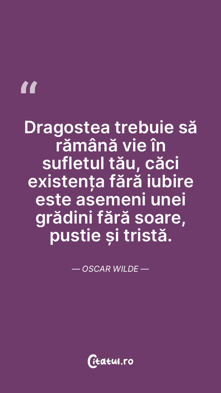 Dragostea trebuie să rămână vie în sufletul tău, căci existența fără iubire este asemeni unei grădini fără soare, pustie și tristă. Oscar Wilde
