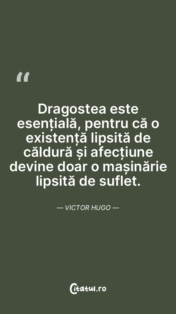 Dragostea este esențială, pentru că o existență lipsită de căldură și afecțiune devine doar o mașinărie lipsită de suflet. Victor Hugo