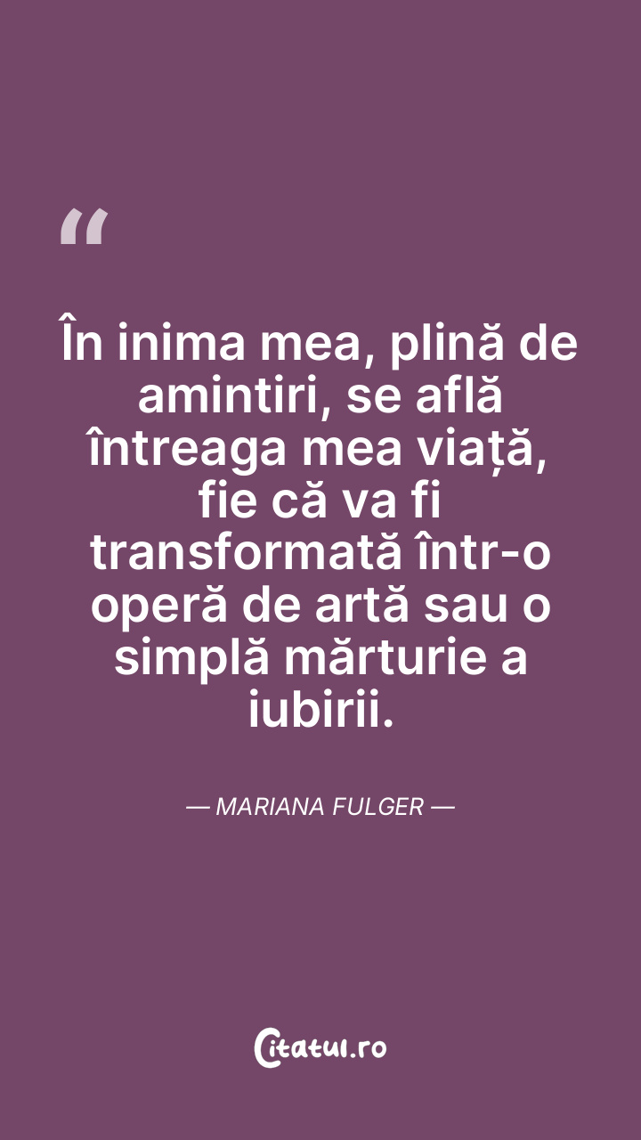 În inima mea, plină de amintiri, se află întreaga mea viață, fie că va fi transformată într-o operă de artă sau o simplă mărturie a iubirii. Mariana Fulger