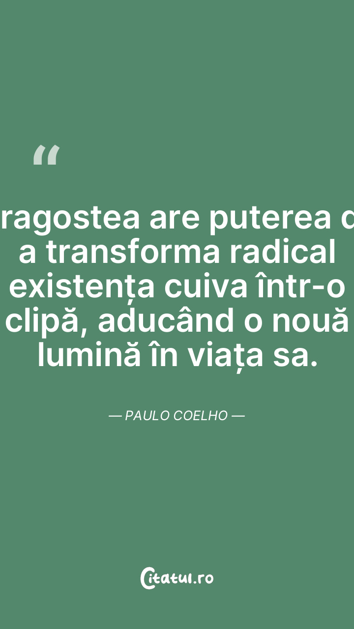 Dragostea are puterea de a transforma radical existența cuiva într-o clipă, aducând o nouă lumină în viața sa. Paulo Coelho