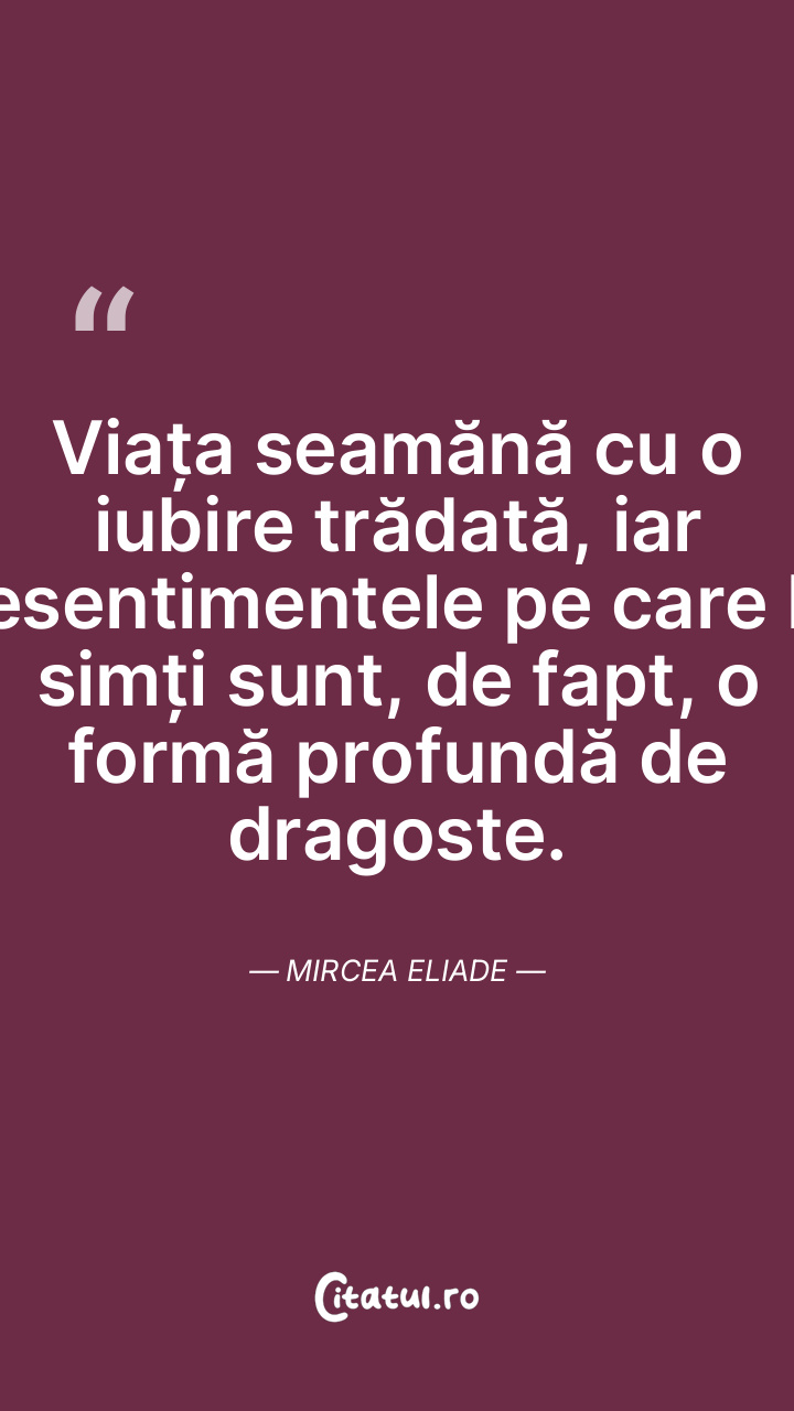 Viața seamănă cu o iubire trădată, iar resentimentele pe care le simți sunt, de fapt, o formă profundă de dragoste. Mircea Eliade