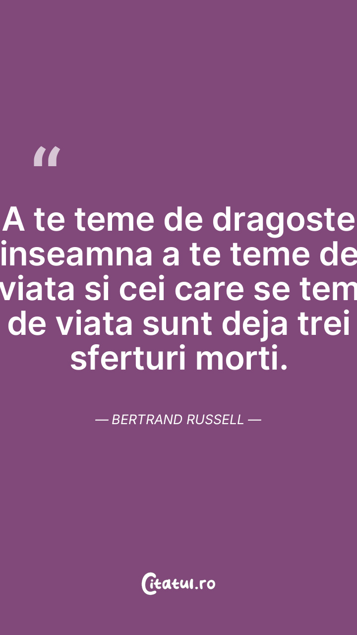 A te teme de dragoste inseamna a te teme de viata si cei care se tem de viata sunt deja trei sferturi morti. Bertrand Russell