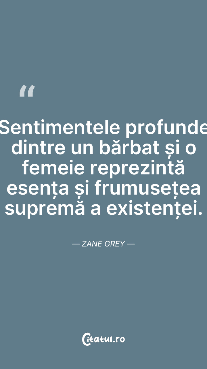 Sentimentele profunde dintre un bărbat și o femeie reprezintă esența și frumusețea supremă a existenței. Zane Grey
