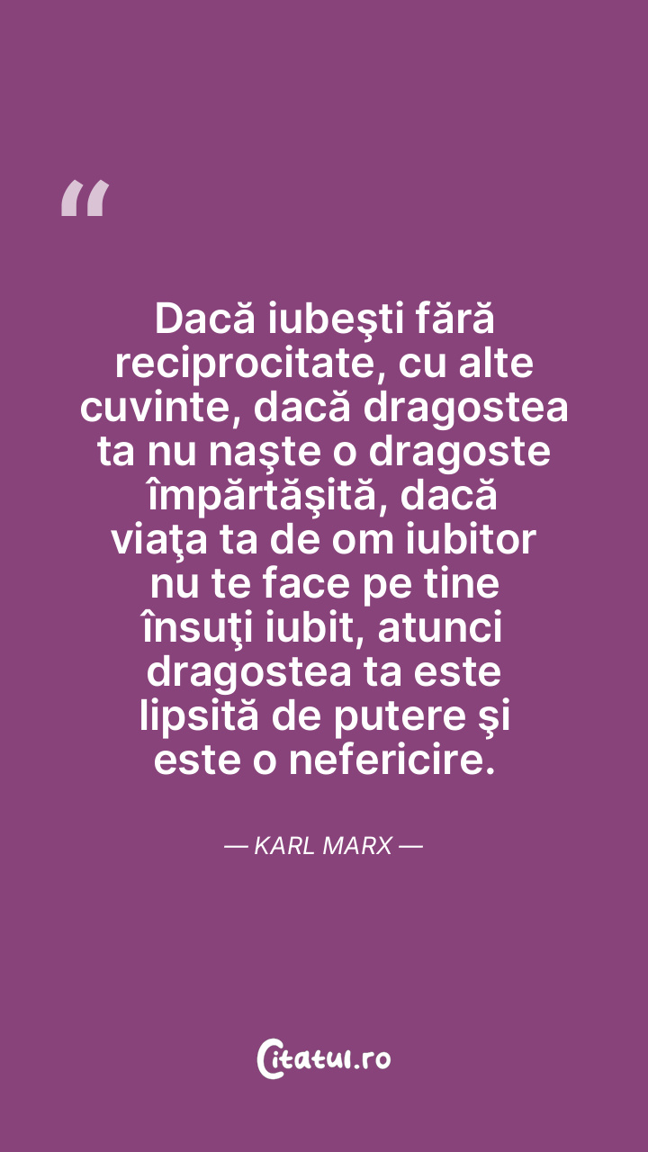 Dacă iubeşti fără reciprocitate, cu alte cuvinte, dacă dragostea ta nu naşte o dragoste împărtăşită, dacă viaţa ta de om iubitor nu te face pe tine însuţi iubit, atunci dragostea ta este lipsită de putere şi este o nefericire. Karl Marx