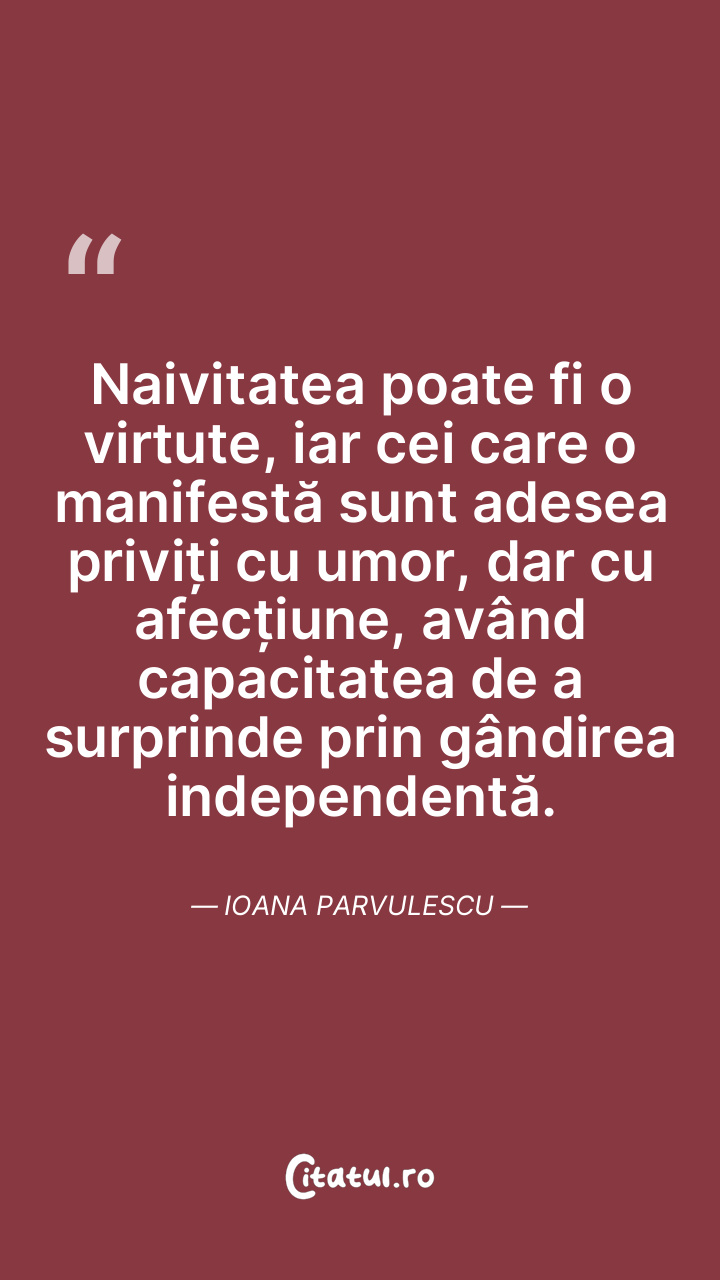 Naivitatea poate fi o virtute, iar cei care o manifestă sunt adesea priviți cu umor, dar cu afecțiune, având capacitatea de a surprinde prin gândirea independentă. Ioana Parvulescu