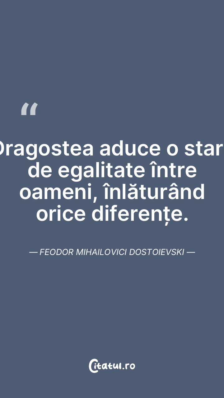 Dragostea aduce o stare de egalitate între oameni, înlăturând orice diferențe. Feodor Mihailovici Dostoievski