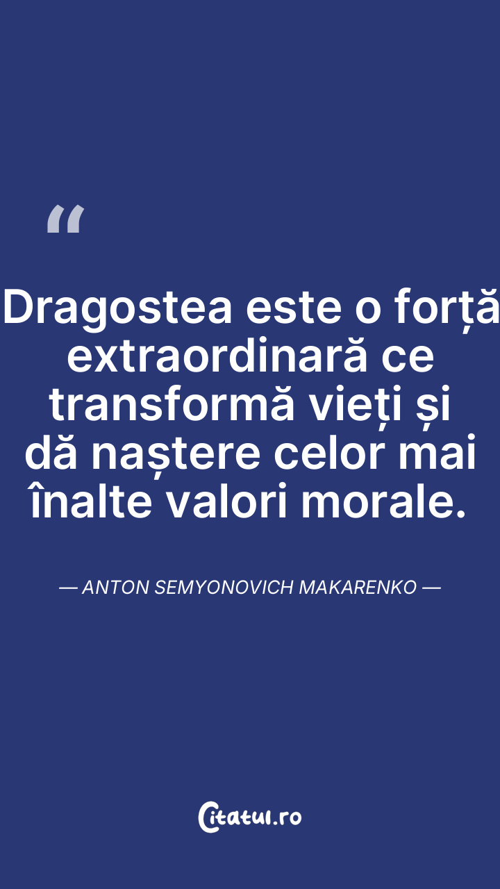 Dragostea este o forță extraordinară ce transformă vieți și dă naștere celor mai înalte valori morale. Anton Semyonovich Makarenko