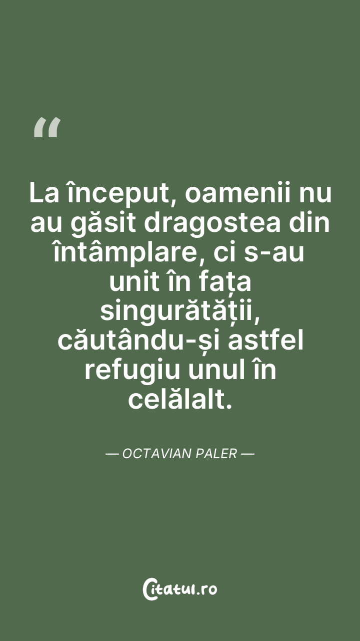La început, oamenii nu au găsit dragostea din întâmplare, ci s-au unit în fața singurătății, căutându-și astfel refugiu unul în celălalt. Octavian Paler