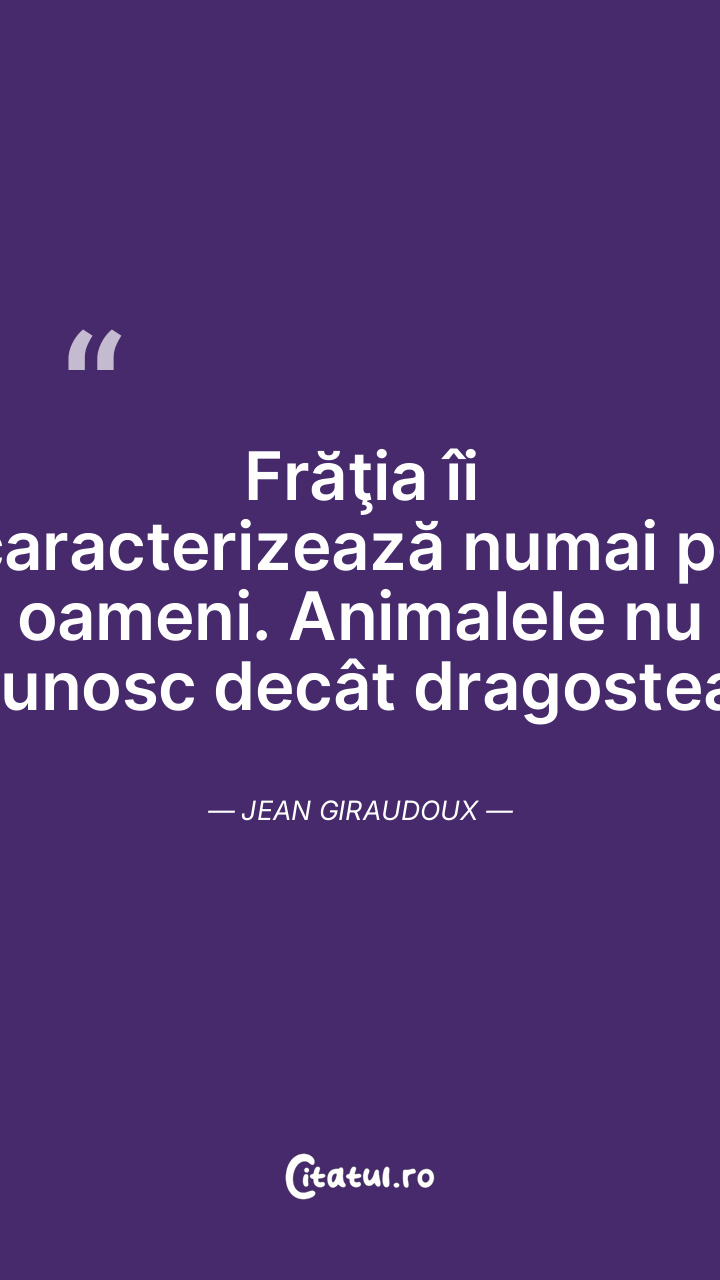Frăţia îi caracterizează numai pe oameni. Animalele nu cunosc decât dragostea. Jean Giraudoux