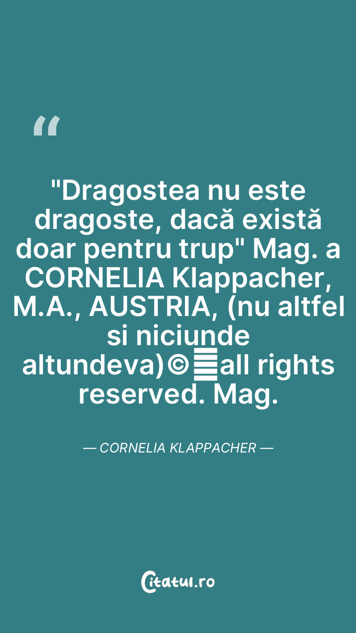 "Dragostea nu este dragoste, dacă există doar pentru trup" Mag. a CORNELIA Klappacher, M.A., AUSTRIA, (nu altfel si niciunde altundeva)©️all rights reserved. Mag. Cornelia Klappacher