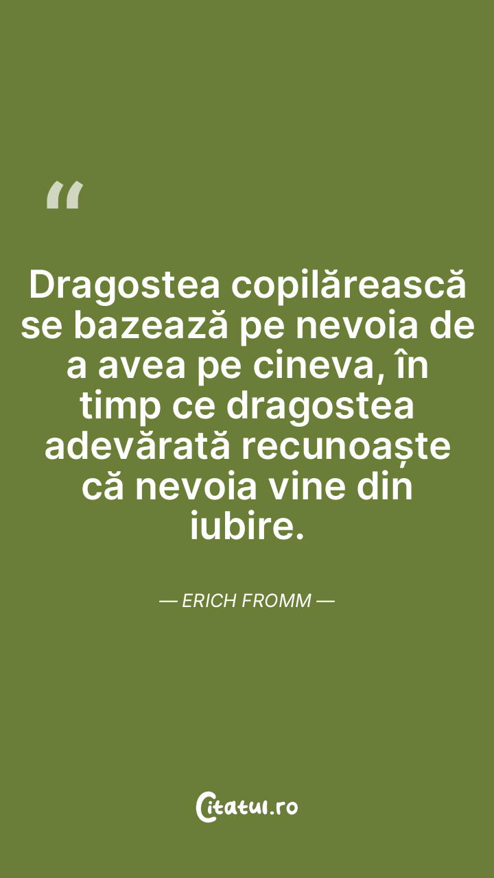 Dragostea copilărească se bazează pe nevoia de a avea pe cineva, în timp ce dragostea adevărată recunoaște că nevoia vine din iubire. Erich Fromm