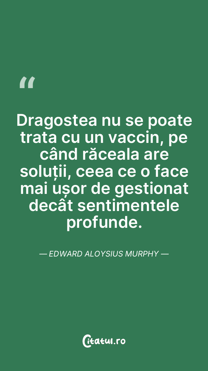 Dragostea nu se poate trata cu un vaccin, pe când răceala are soluții, ceea ce o face mai ușor de gestionat decât sentimentele profunde. Edward Aloysius Murphy