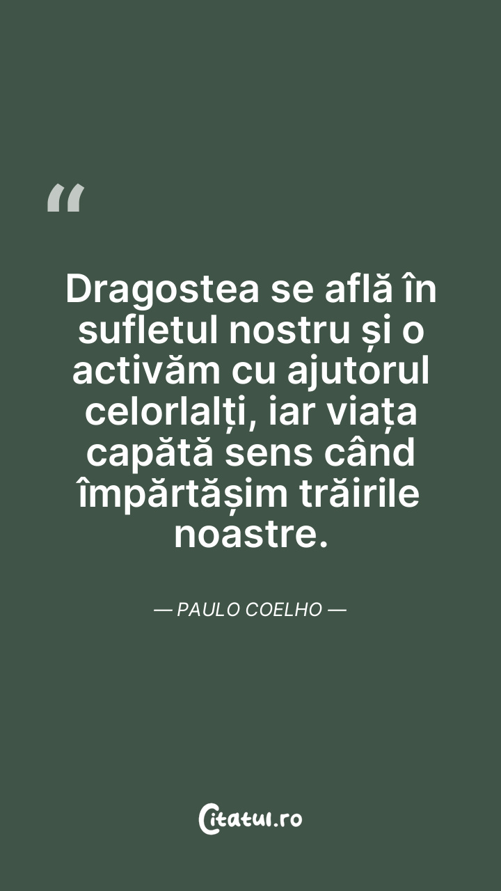 Dragostea se află în sufletul nostru și o activăm cu ajutorul celorlalți, iar viața capătă sens când împărtășim trăirile noastre. Paulo Coelho