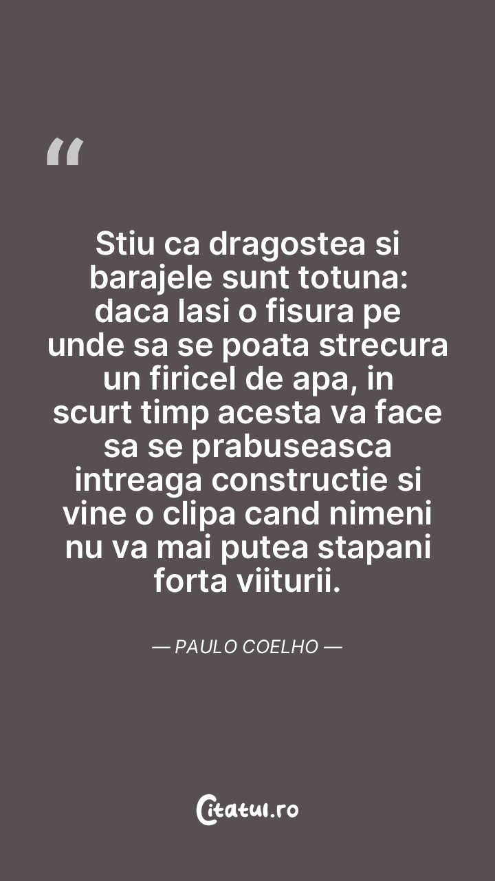 Stiu ca dragostea si barajele sunt totuna: daca lasi o fisura pe unde sa se poata strecura un firicel de apa, in scurt timp acesta va face sa se prabuseasca intreaga constructie si vine o clipa cand nimeni nu va mai putea stapani forta viiturii. Paulo Coelho