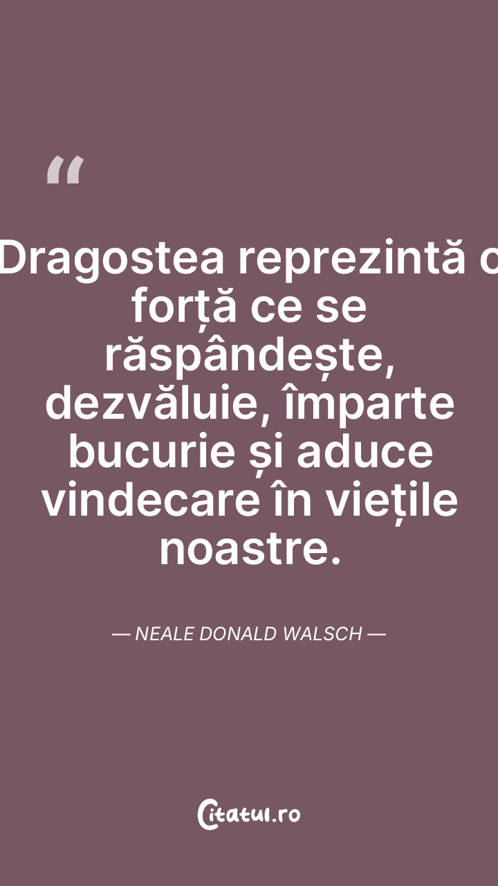 Dragostea reprezintă o forță ce se răspândește, dezvăluie, împarte bucurie și aduce vindecare în viețile noastre. Neale Donald Walsch