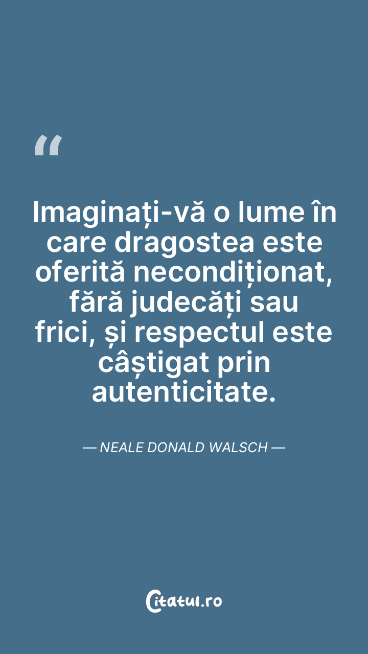 Imaginați-vă o lume în care dragostea este oferită necondiționat, fără judecăți sau frici, și respectul este câștigat prin autenticitate. Neale Donald Walsch