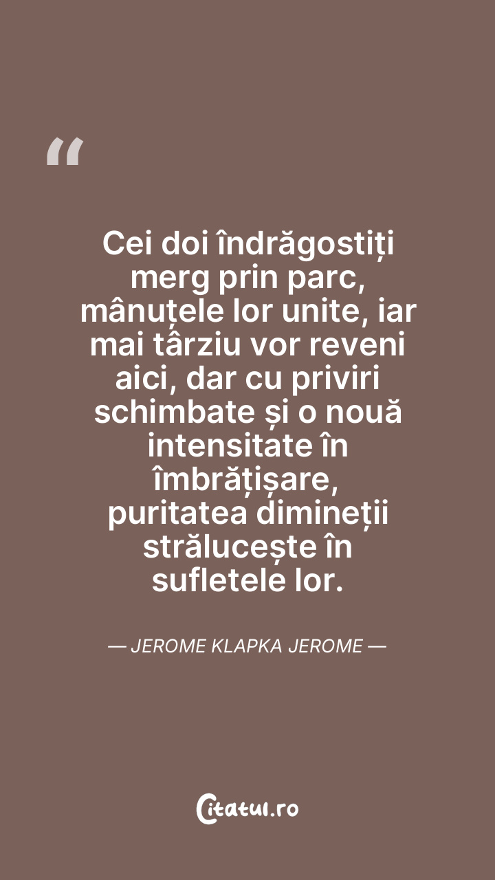 Cei doi îndrăgostiți merg prin parc, mânuțele lor unite, iar mai târziu vor reveni aici, dar cu priviri schimbate și o nouă intensitate în îmbrățișare, puritatea dimineții strălucește în sufletele lor. Jerome Klapka Jerome