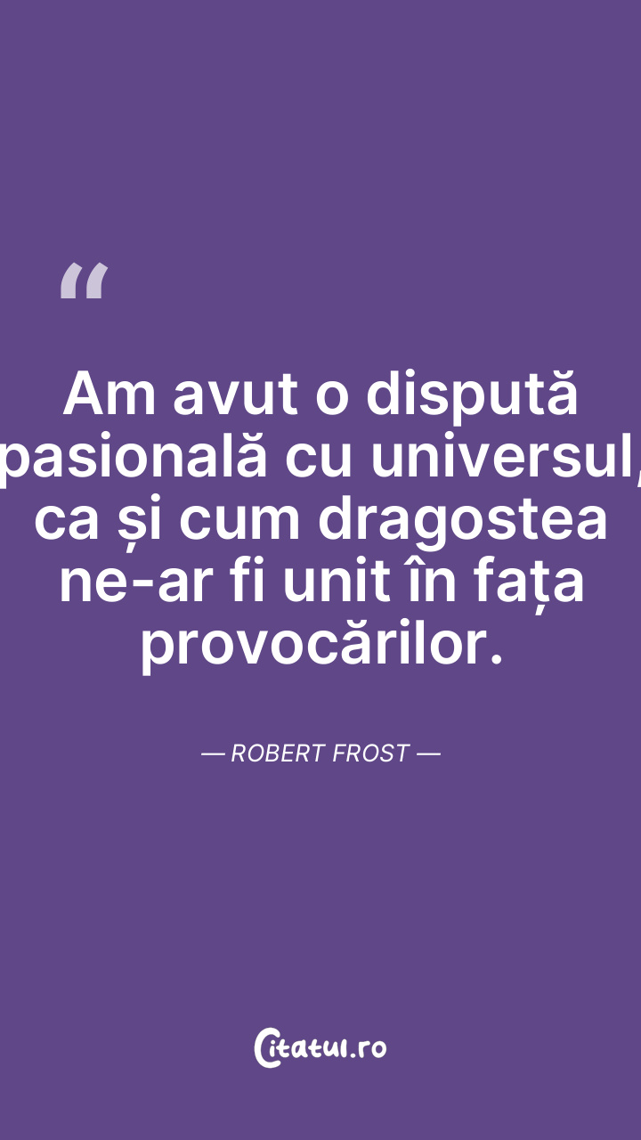 Am avut o dispută pasională cu universul, ca și cum dragostea ne-ar fi unit în fața provocărilor. Robert Frost