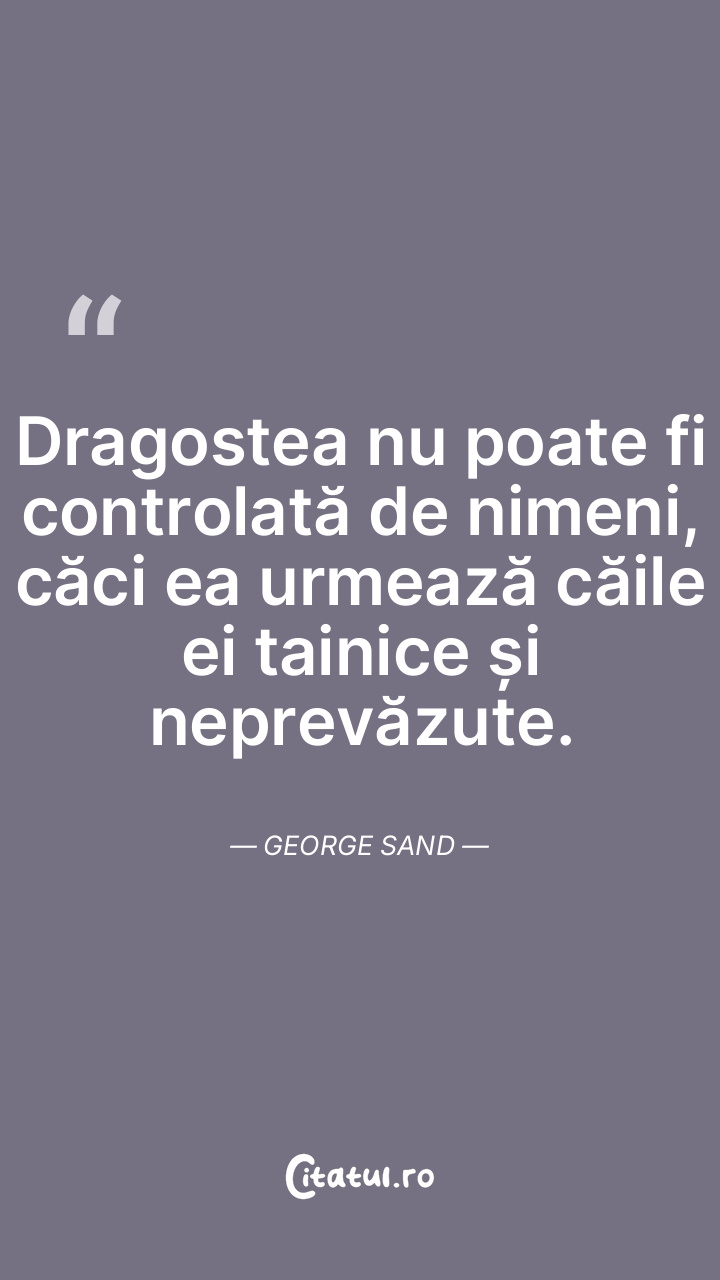 Dragostea nu poate fi controlată de nimeni, căci ea urmează căile ei tainice și neprevăzute. George Sand