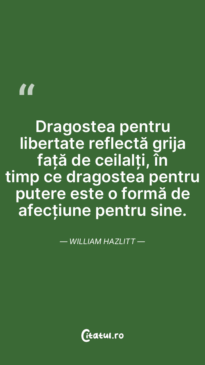 Dragostea pentru libertate reflectă grija față de ceilalți, în timp ce dragostea pentru putere este o formă de afecțiune pentru sine. William Hazlitt