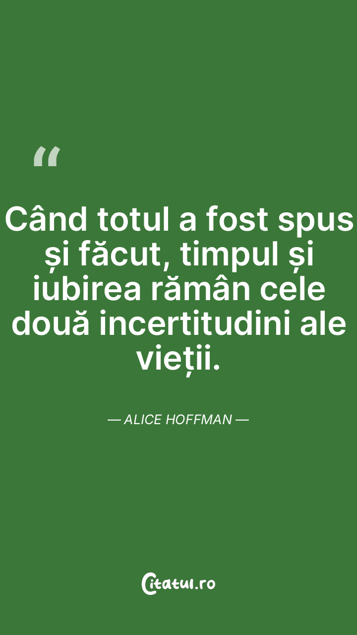 Când totul a fost spus și făcut, timpul și iubirea rămân cele două incertitudini ale vieții. Alice Hoffman