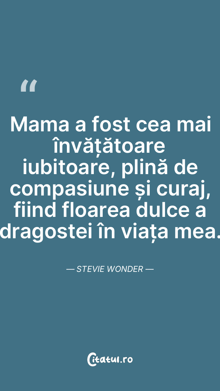 Mama a fost cea mai învățătoare iubitoare, plină de compasiune și curaj, fiind floarea dulce a dragostei în viața mea. Stevie Wonder