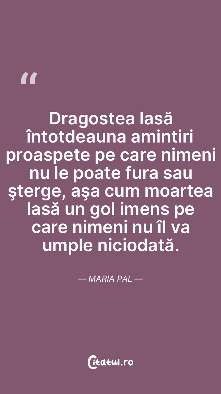 Dragostea lasă întotdeauna amintiri proaspete pe care nimeni nu le poate fura sau şterge, aşa cum moartea lasă un gol imens pe care nimeni nu îl va umple niciodată. Maria Pal