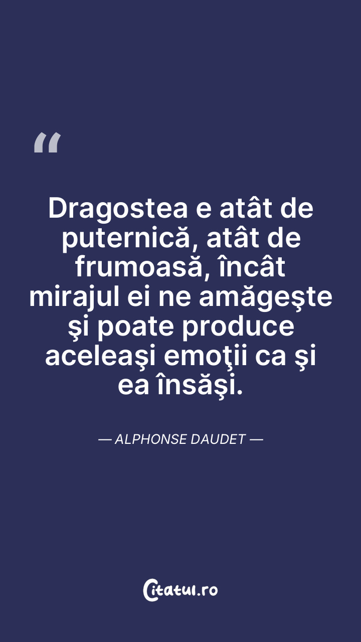 Dragostea e atât de puternică, atât de frumoasă, încât mirajul ei ne amăgeşte şi poate produce aceleaşi emoţii ca şi ea însăşi. Alphonse Daudet