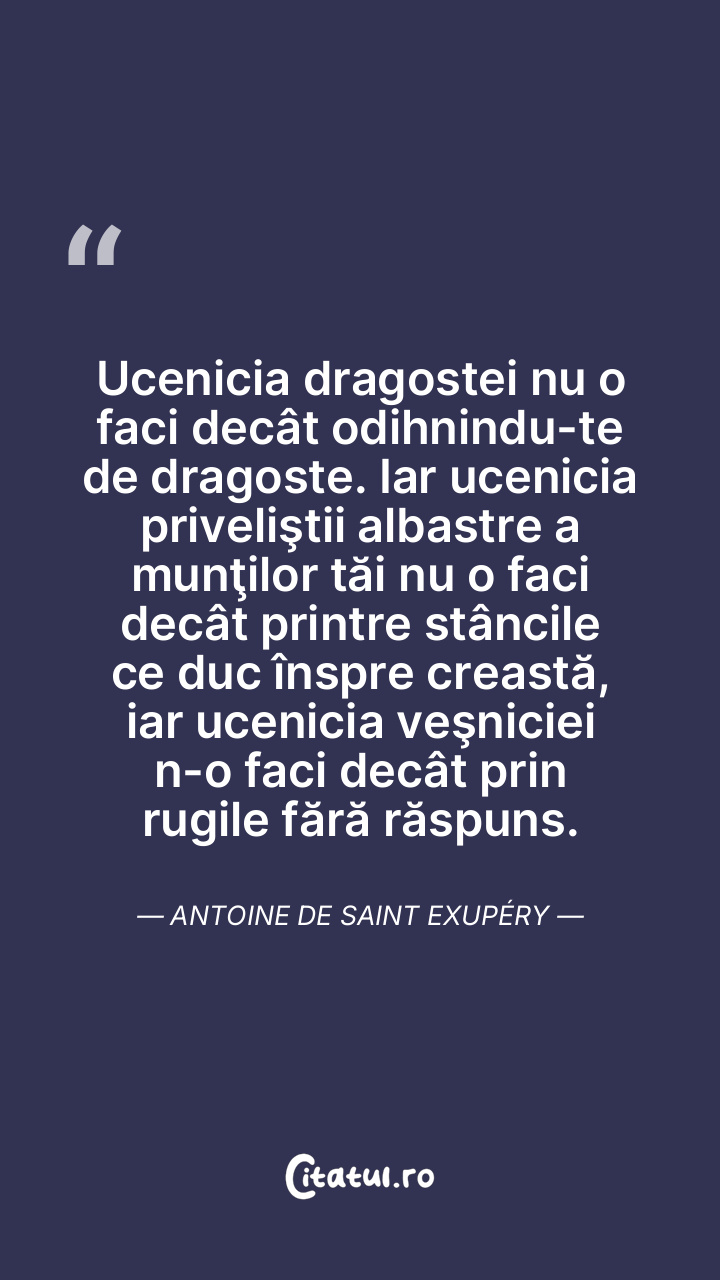Ucenicia dragostei nu o faci decât odihnindu-te de dragoste. Iar ucenicia priveliştii albastre a munţilor tăi nu o faci decât printre stâncile ce duc înspre creastă, iar ucenicia veşniciei n-o faci decât prin rugile fără răspuns. Antoine de Saint Exupéry