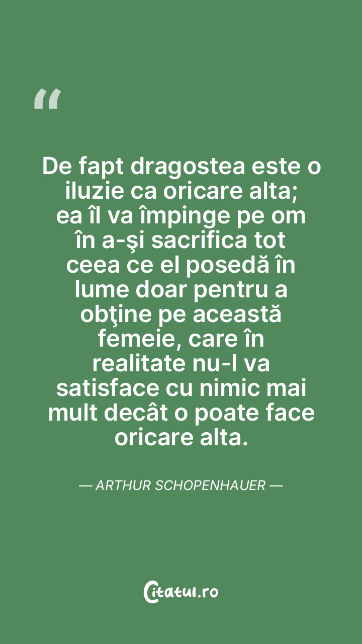 De fapt dragostea este o iluzie ca oricare alta; ea îl va împinge pe om în a-şi sacrifica tot ceea ce el posedă în lume doar pentru a obţine pe această femeie, care în realitate nu-l va satisface cu nimic mai mult decât o poate face oricare alta. Arthur Schopenhauer