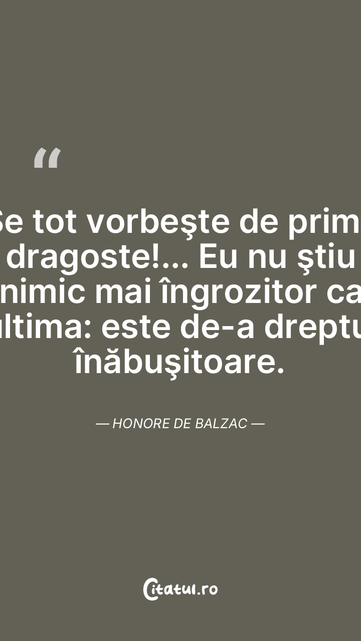 Se tot vorbeşte de prima dragoste!... Eu nu ştiu nimic mai îngrozitor ca ultima: este de-a dreptul înăbuşitoare. Honore de Balzac