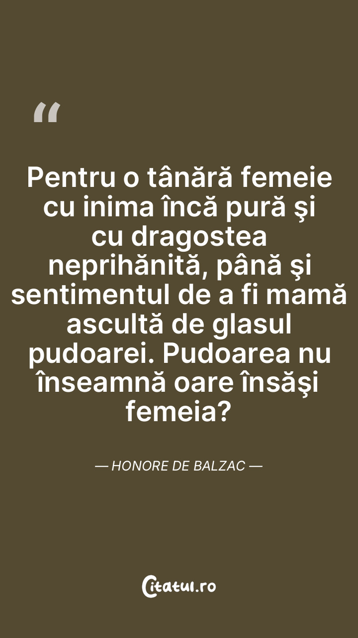 Pentru o tânără femeie cu inima încă pură şi cu dragostea neprihănită, până şi sentimentul de a fi mamă ascultă de glasul pudoarei. Pudoarea nu înseamnă oare însăşi femeia? Honore de Balzac