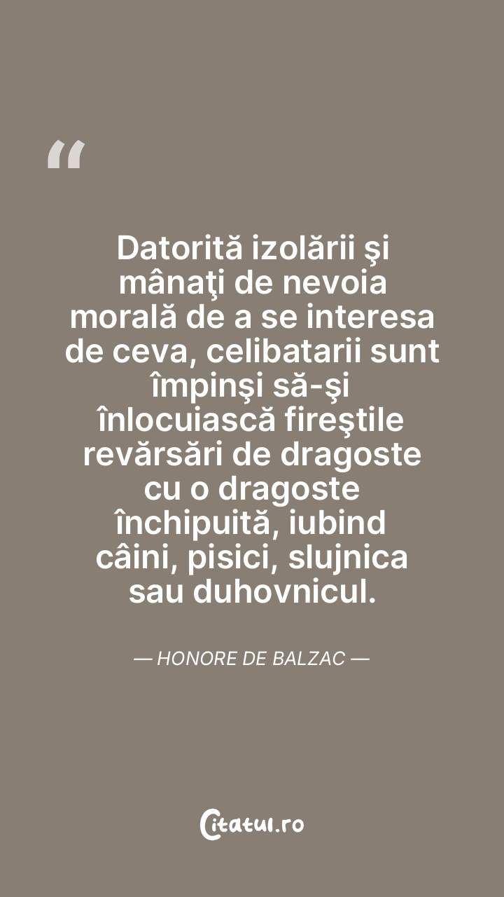 Datorită izolării şi mânaţi de nevoia morală de a se interesa de ceva, celibatarii sunt împinşi să-şi înlocuiască fireştile revărsări de dragoste cu o dragoste închipuită, iubind câini, pisici, slujnica sau duhovnicul. Honore de Balzac